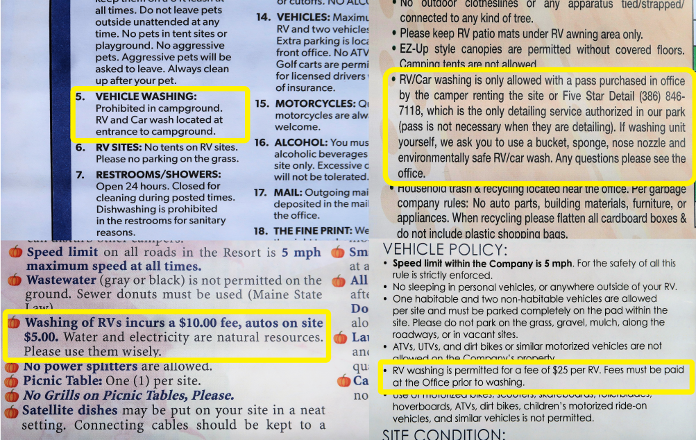The rules that managers fairly consistently enforce are the rules that make the campground money. These rules are financial costs of add-ons you may not be aware of at the time of booking your site. For example, the State of Maine now has a $5.00 camping fee for making a reservation. The following are all add-ons that we have experienced in our travels. As you can tell, we have been surprised more than once by extra fees and costs!